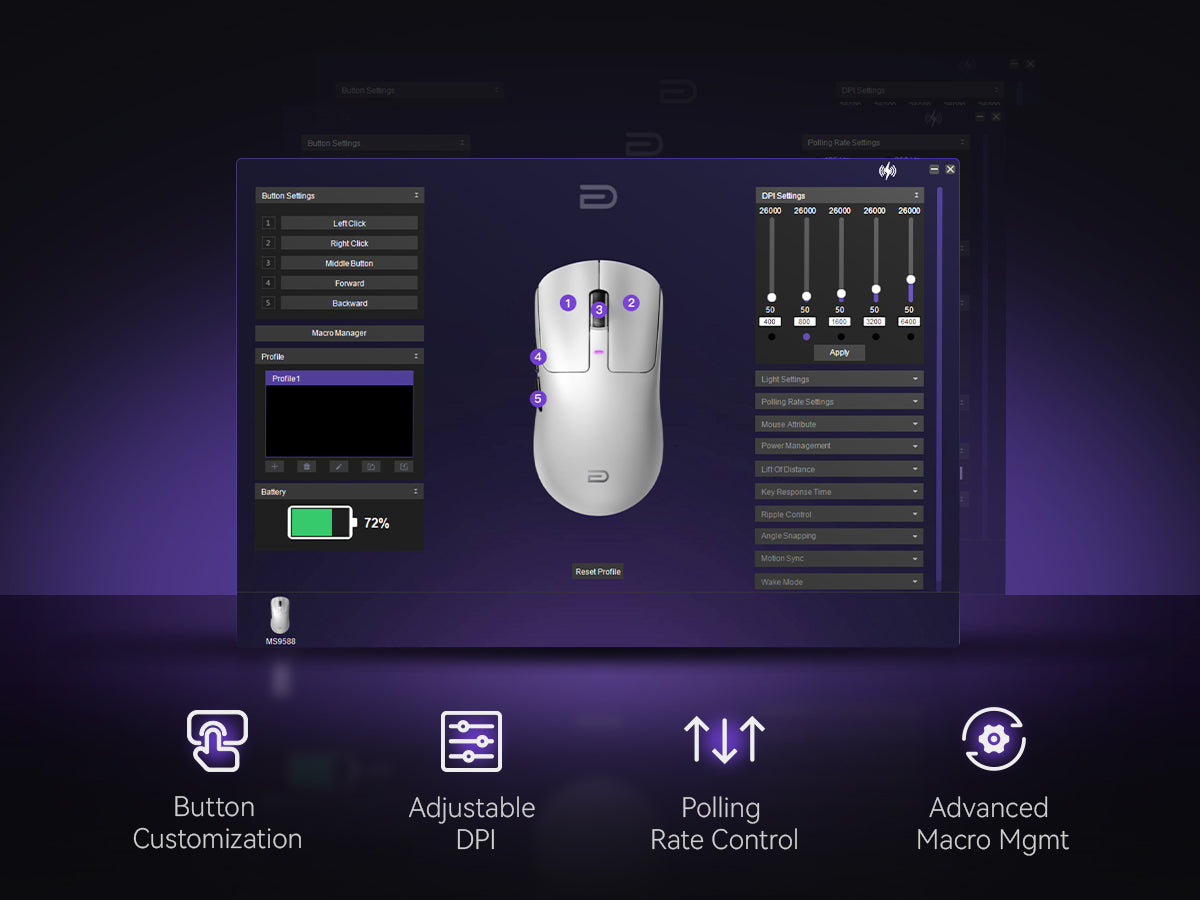 | DPI (Min/Max) | 400-800-1600-3200-6400 (26000 available on Windows) | |